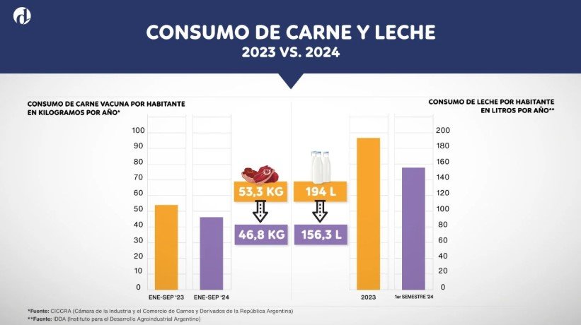 En paralelo, el consumo de lácteos retrocedió 17,3% en toneladas y 14,4% en litros en el primer semestre del año frente al mismo periodo de 2023 y si continúa con esta tendencia, terminará el 2024 como el registro más bajo de la historia, según un informe del Instituto para el Desarrollo Agroindustrial Argentino (IDAA).