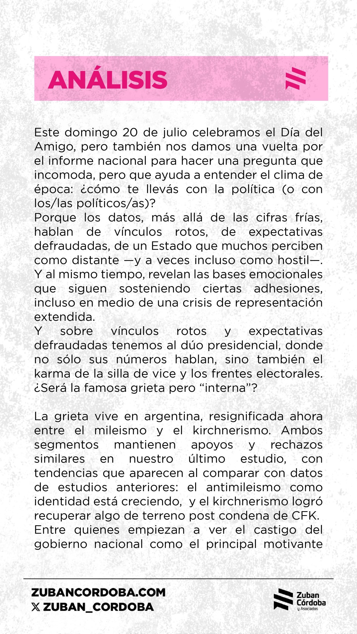 En paralelo, el antikirchnerismo pasó del 53,1% en mayo de 2024 a 52,6% en enero de 2025 y bajó nuevamente en julio al 45,2%.