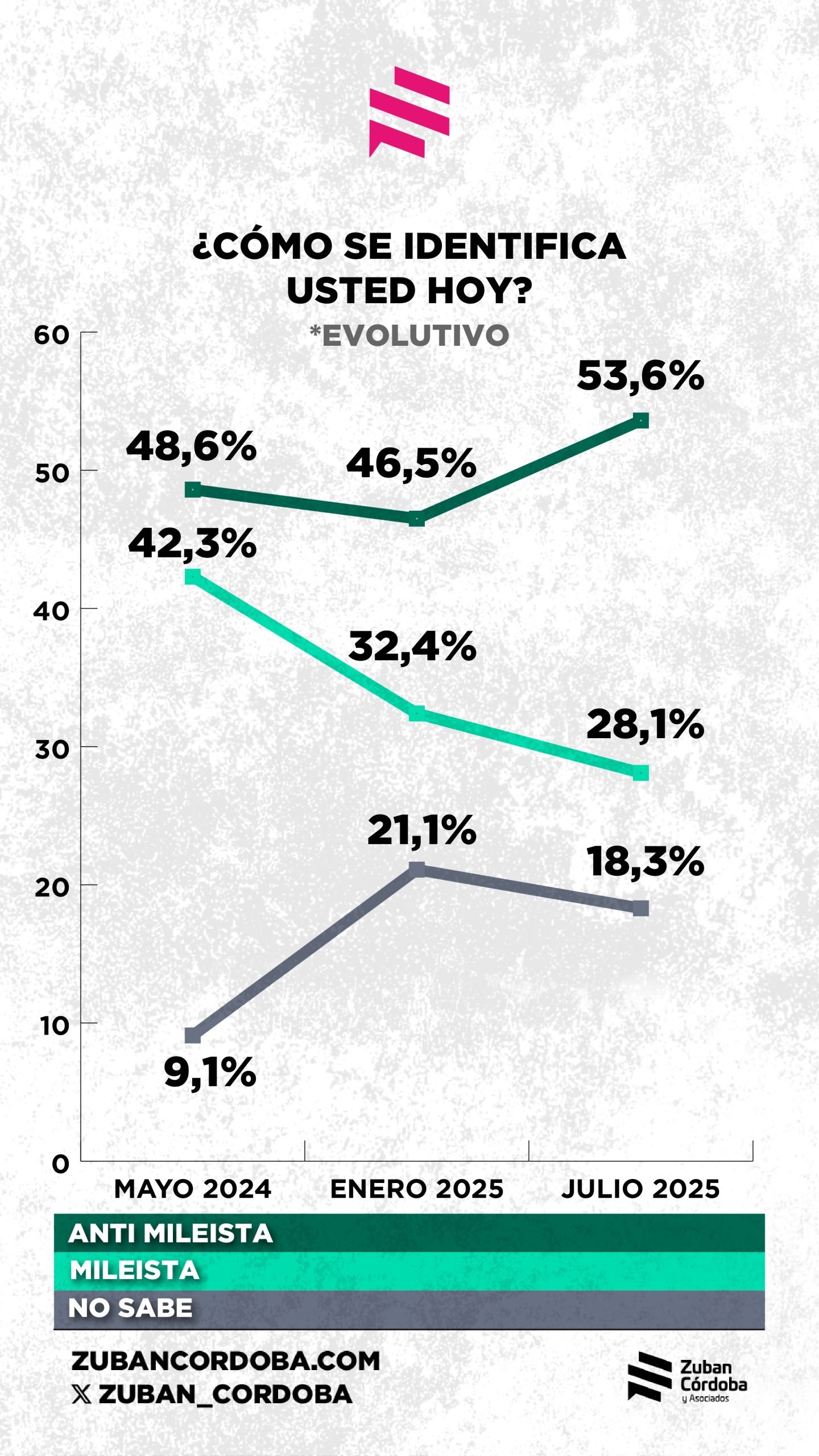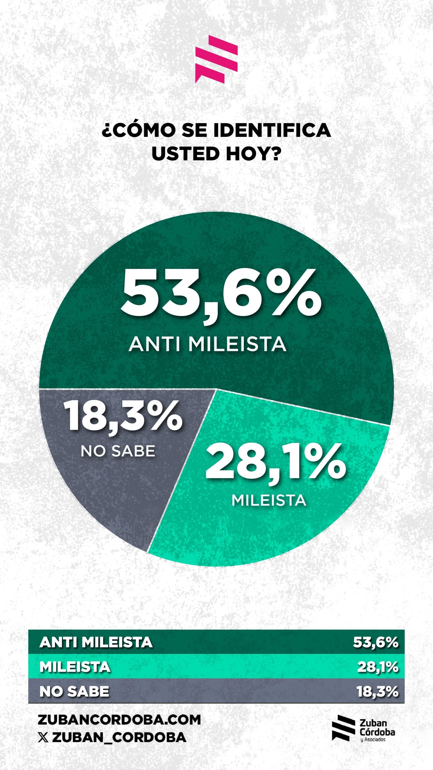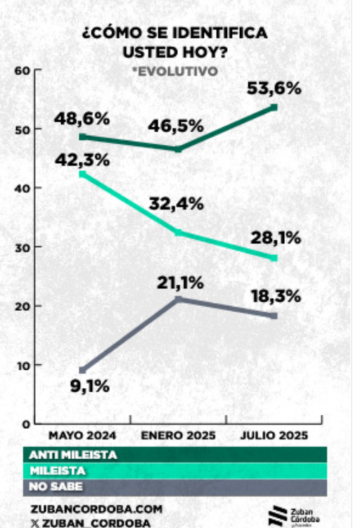 El antimileismo se ha convertido en el nuevo dato saliente de la política argentina y ya supera la mitad de la población con un 53,6%, según revela el último trabajo de Zuban-Córdoba, cerrado este mes. Desde enero la identificación con los libertarios bajó 4,3% y la resistencia a La Libertad Avanza subió 7,1%.