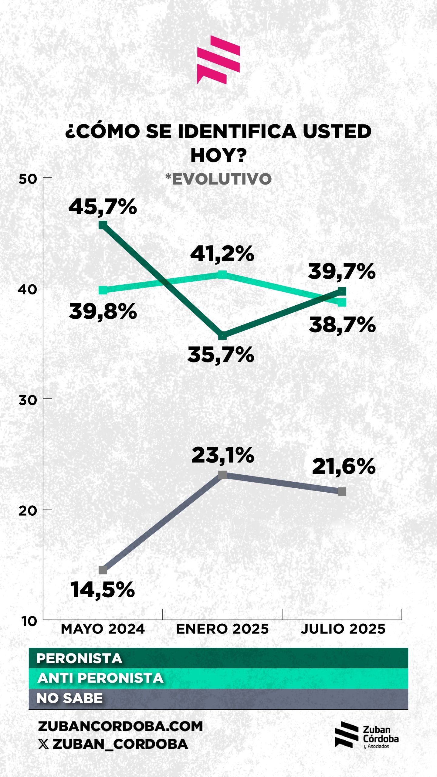 La rivalidad entre peronistas y antiperonistas es más pareja: el 39,7% de los consultados se define como peronista y el 38,7% es anti. La evolución muestra que los apoyos al PJ se recuperaron después de caer en enero de 2025: pasaron del 45,7% en mayo de 2024 al 35,7% en enero de 2025 y ahora alcanzan el 39,7%. Los anti se mantienen en torno al 39%, tras una leve suba en enero de 2025.