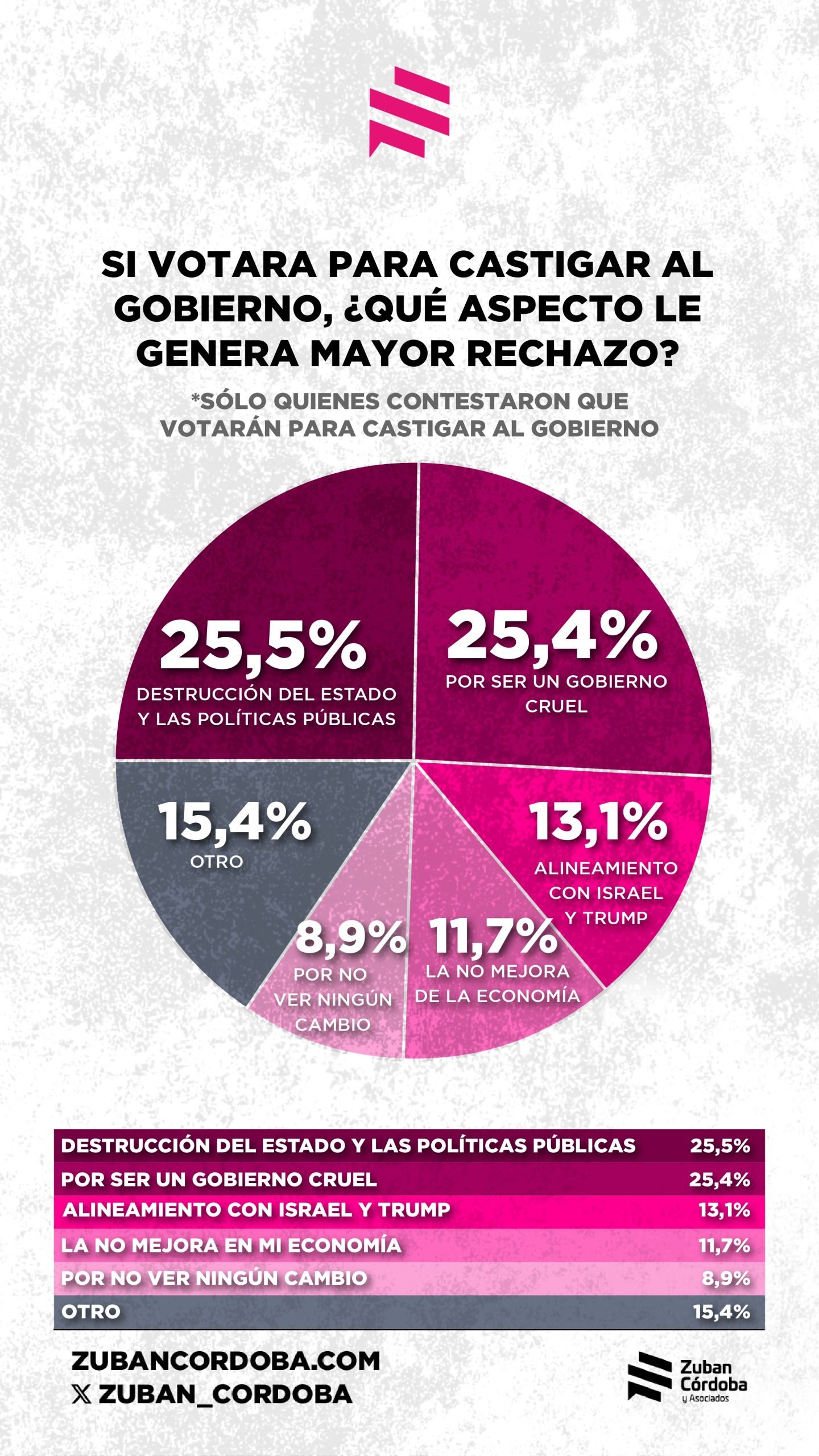 El 50% de los que quieren castigar al oficialismo critica la «destrucción del estado y las políticas públicas» y la crueldad del gobierno. El 13,1% rechaza el alineamiento con Israel y Donald Trump.