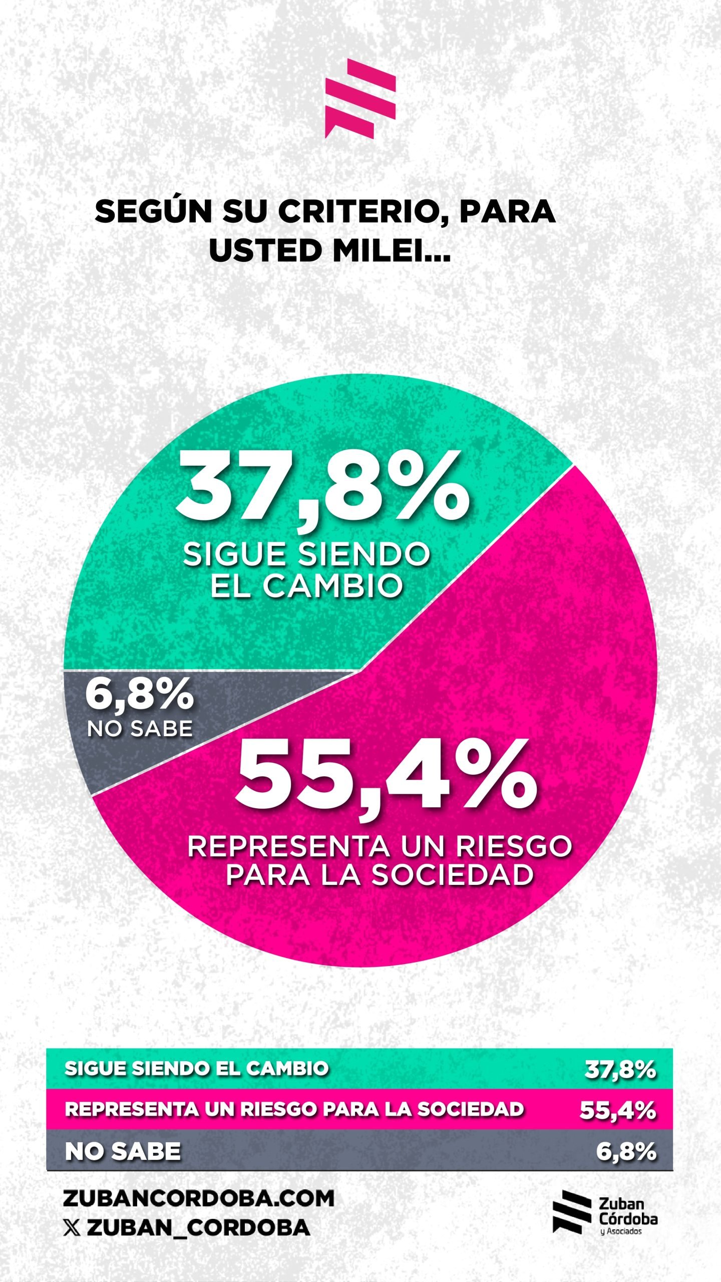 «El 55,4% de los consultados ve a Milei como un riesgo para la sociedad y el 37,8% piensa que sigue siendo el cambio».