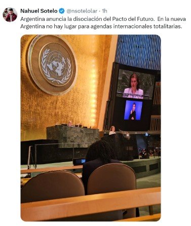 «Argentina anuncia la disociación del Pacto del Futuro. En la nueva Argentina no hay lugar para agendas internacionales totalitarias», subrayó el secretario de Culto y Civilización, Nahuel Sotelo. El funcionario nacional lo anunció en sus redes sociales junto a una fotografía de la canciller Diana Mondino en el momento en que oficializó la postura de la Argentina sobre el tema.