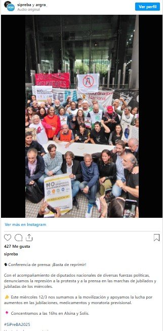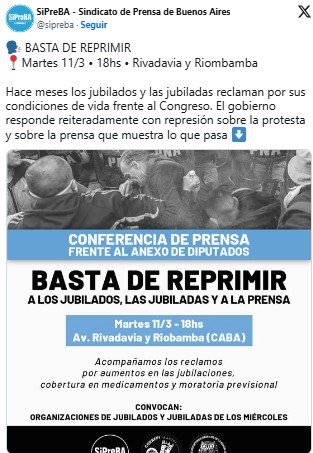 Por eso, y en el marco de la preparación de la movilización de 12 de marzo que promete ser masiva ante la convocatoria creciente de hinchadas de fútbol y sindicatos, el Sindicato de Prensa de Buenos Aires (SiPreBA), la Asociación de Reporteros Gráficos de la República Argentina (ARGRA) y la Coordinadora contra la Represión Policial e Institucional (Correpi) promovieron y propusieron a las organizaciones de jubilados a realizar en común una conferencia de prensa para denunciar el ajuste contra los trabajadores pasivos y la represión policial que sufren ellos junto con los trabajadores de prensa.