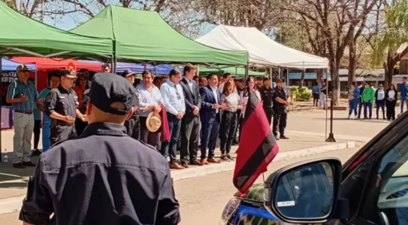 El ministro de Seguridad y Justicia, Gaspar Solá Usandivaras, y el intendente de Aguaray, Guillermo Aleman, encabezaron el acto de entrega de una camioneta 0 km para la dependencia de la localidad perteneciente al Distrito de Prevención 4 de Tartagal.