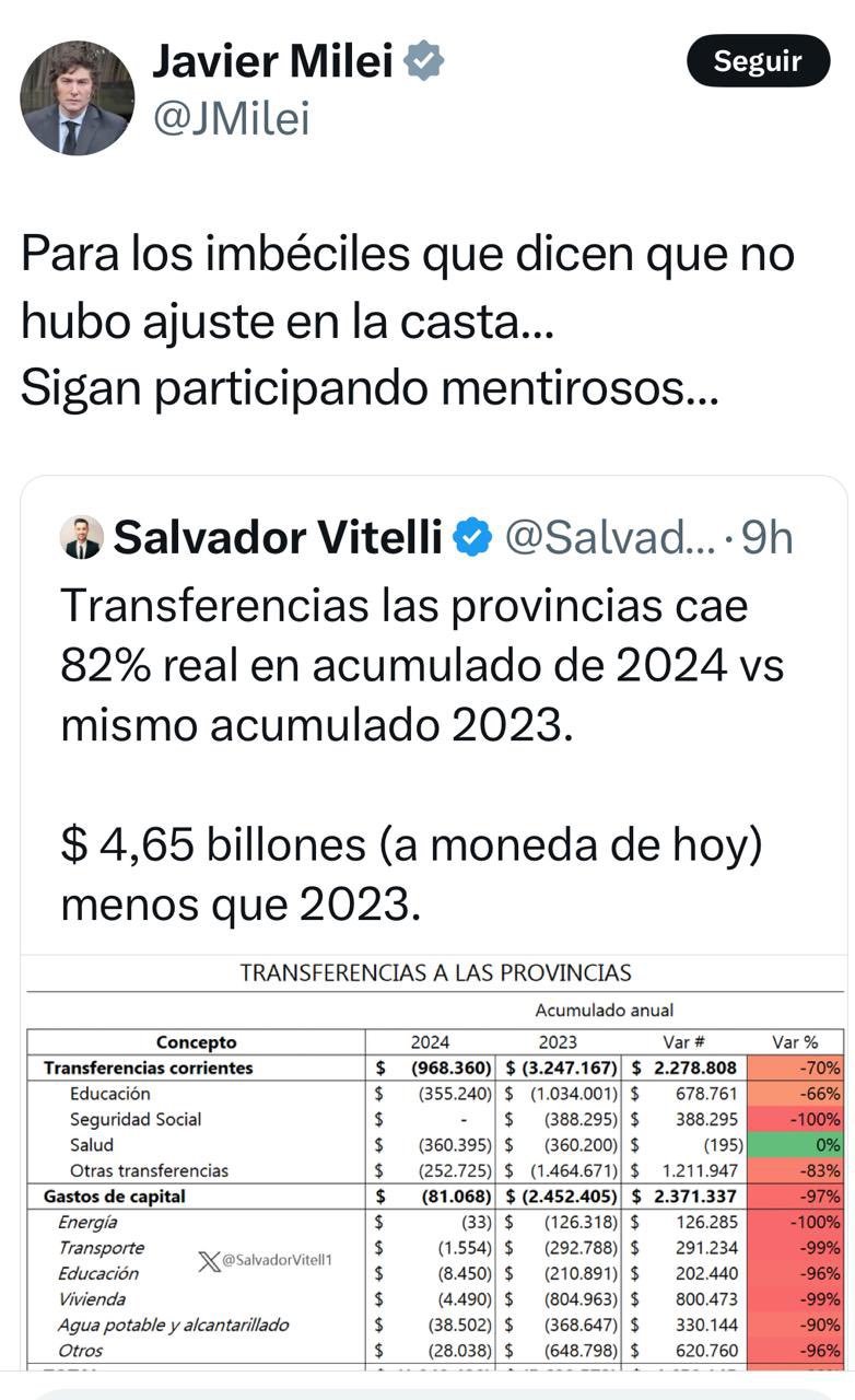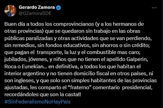 “Buen día a todos los comprovincianos”, aquí “les comparto el ‘fraterno’ comentario presidencial, recordándoles que son la casta”, escribió Zamora y retuiteó un posteo de Milei que dice: “Para los imbéciles que dicen que no hubo ajuste en la casa… Sigan participando, mentirosos”.