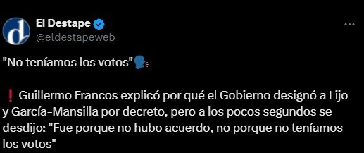 Paoltroni también usó sus redes para cruzar al presidente Provisional del Senado, Bartolomé Abdala, por haber expresado en una entrevista su conformidad con las designaciones por decreto. Al igual que el formoseño, quien hizo público su rechazo meses atrás a la figura de Lijo es la vicepresidenta Victoria Villarruel.