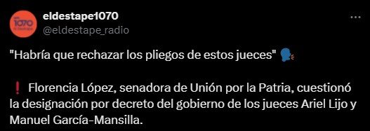 El interbloque emitió un comunicado ayer en el que señalaron que «esta forma de designación es manifiestamente inconstitucional y conforma una nueva afrenta al sistema democrático y federal establecido por la Constitución nacional». En una entrevista con El Destape 1070, la senadora Florencia López señaló que el nombramiento «es nula de nulidad absoluta» y anticipó el rechazo del bloque a los ministros designados en comisión.