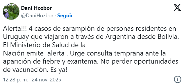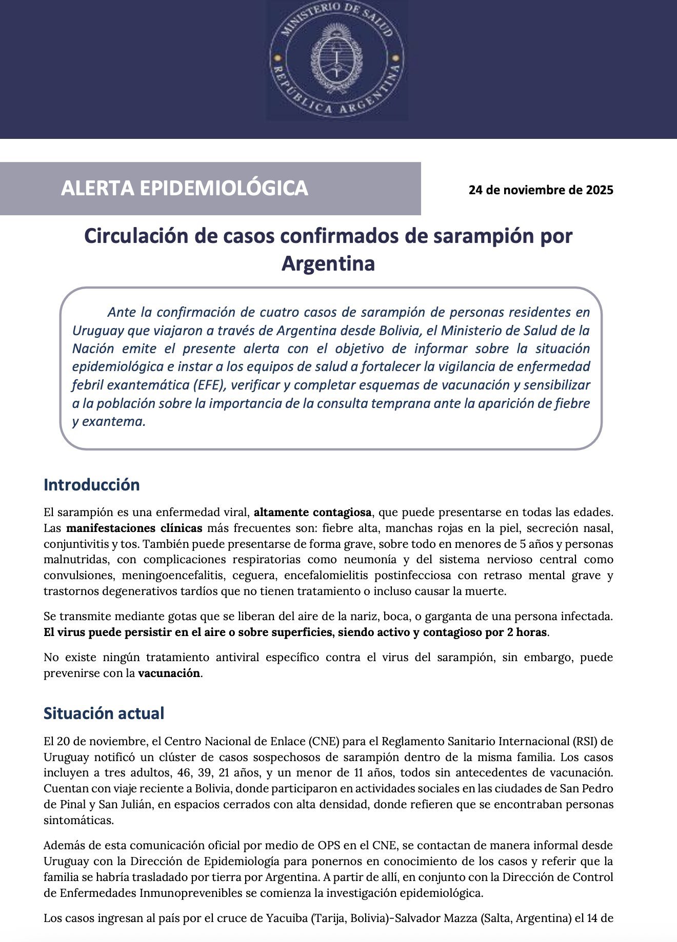 A pocos días de haber celebrado que se contuvo el brote de sarampión iniciado en el país en febrero pasado, el Ministerio de Salud de la Nación tuvo que emitir una nueva alerta ante el riesgo de propagación de esa enfermedad, altamente contagiosa. Porque se confirmaron cuatro casos en una familia de residentes uruguayos, procedentes de Bolivia, que viajaron por todo el país con la enfermedad a cuestas y sin antecedente de vacunación.