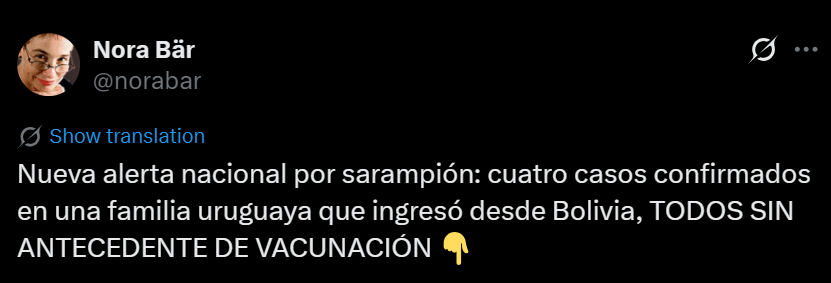 De acuerdo al comunicado del Ministerio de Salud argentino, el 20 de noviembre el Centro Nacional de Enlace (CNE) para el Reglamento Sanitario Internacional (RSI) de Uruguay notificó un clúster de casos sospechosos de sarampión dentro de la misma familia. Se trata de tres adultos –de 46, 39 y 21 años- y un menor de 11 años, todos sin antecedentes de vacunación.