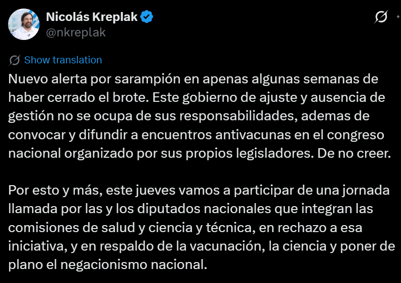 “Nuevo alerta por sarampión en apenas algunas semanas de haber cerrado el brote. Este gobierno de ajuste y ausencia de gestión no se ocupa de sus responsabilidades, ademas de convocar y difundir a encuentros antivacunas en el congreso nacional organizado por sus propios legisladores. De no creer”, escribió el ministro de Salud bonaerense, Nicolás Kreplak, en su cuenta de X.