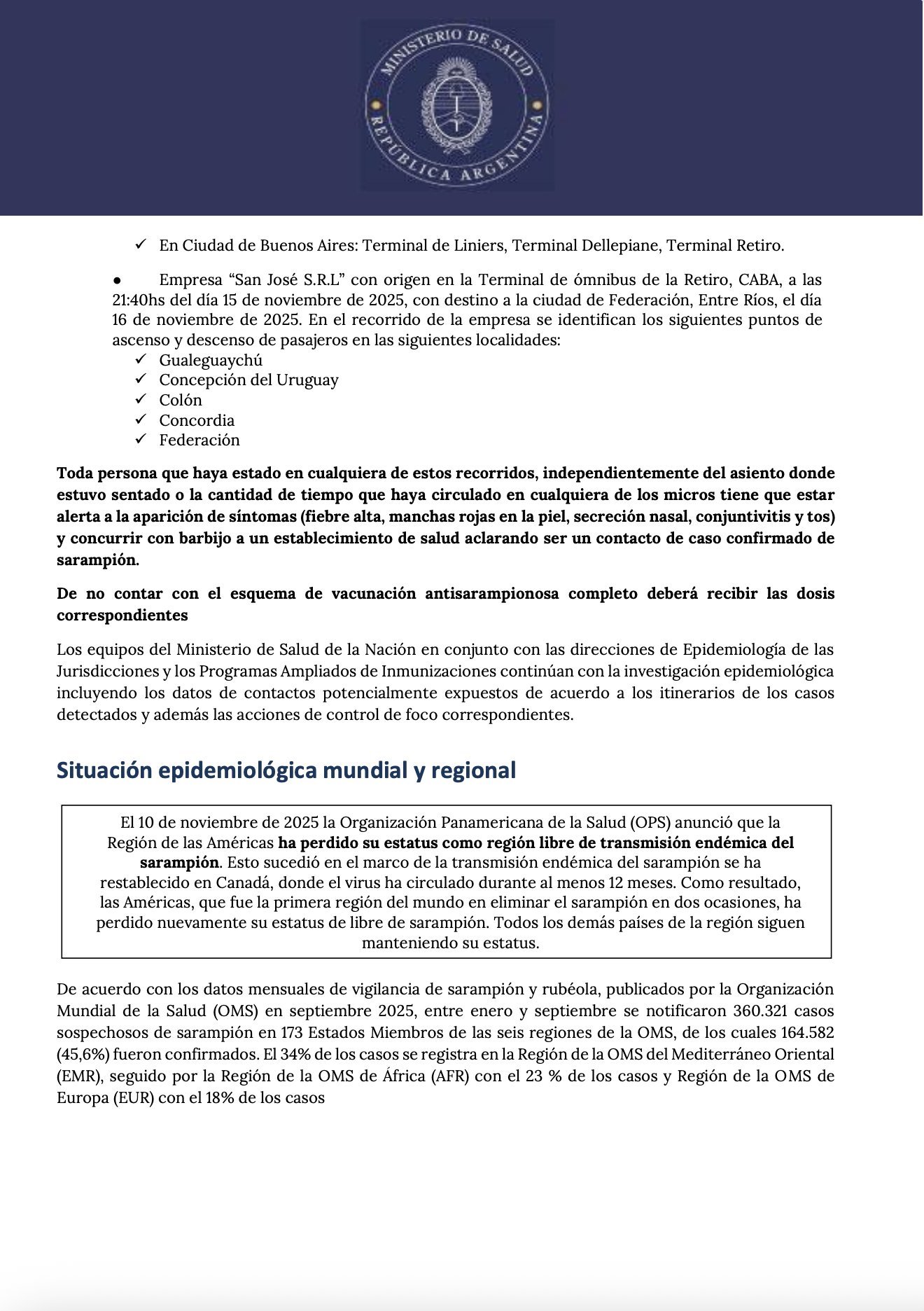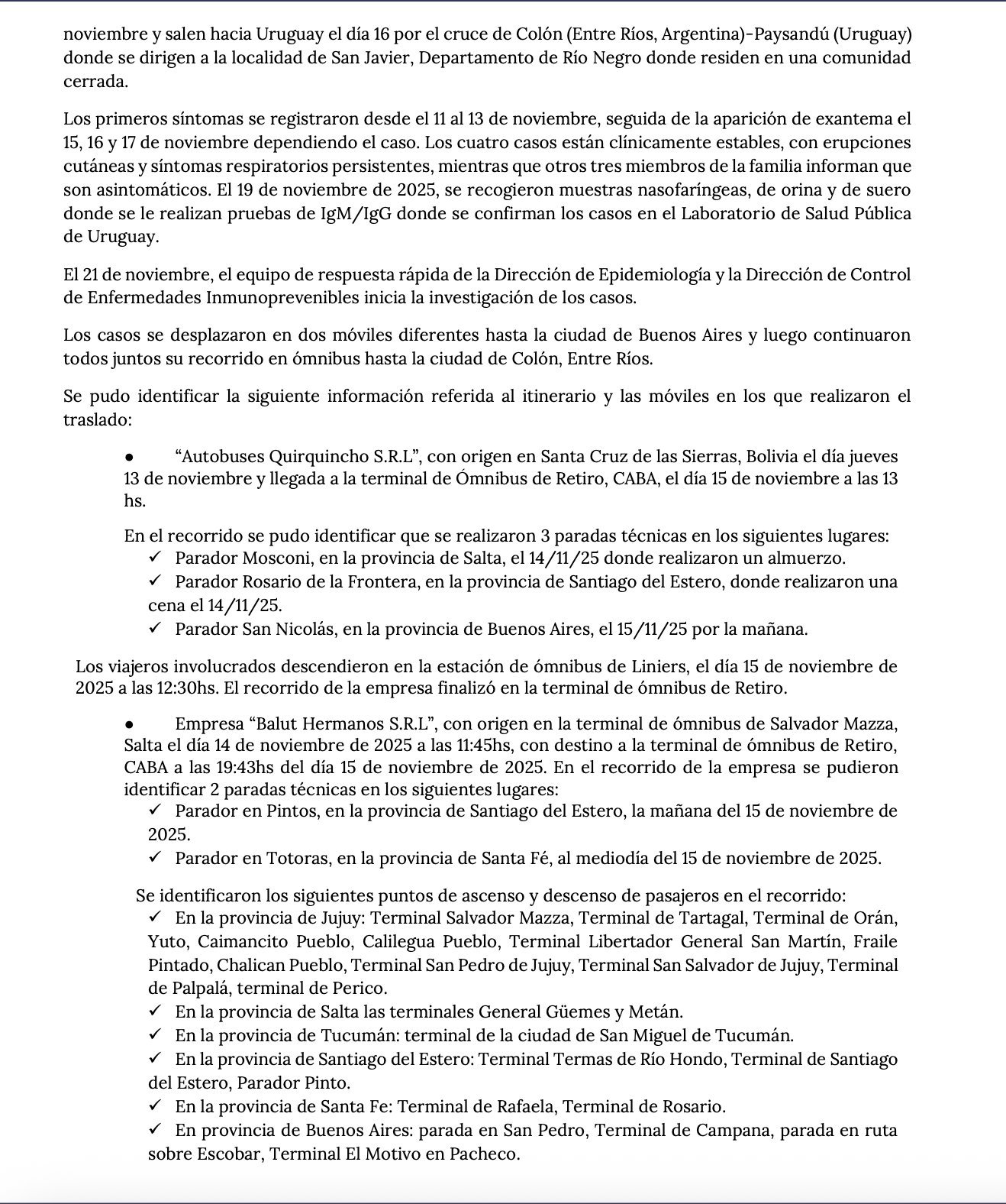 El Ministerio de Salud argentino informó sobre el desplazamiento de las personas afectadas, para que quienes hayan compartido el trayecto puedan estar alerta ante la aparición de síntomas: “Los casos se desplazaron en dos móviles diferentes hasta la ciudad de Buenos Aires y luego continuaron todos juntos su recorrido en ómnibus hasta la ciudad de Colón, Entre Ríos. Se pudo identificar la siguiente información referida al itinerario y a los móviles en los que realizaron el traslado: