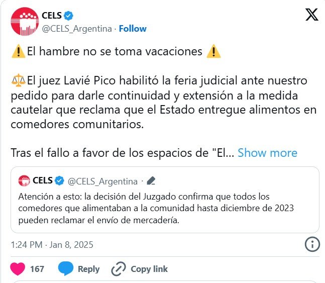 El CELS celebró la decisión de Lavié Pico y tuiteó el miércoles: “El hambre no se toma vacaciones”. “El juez Lavié Pico habilitó la feria judicial ante nuestro pedido para darle continuidad y extensión a la medida cautelar que reclama que el Estado entregue alimentos en comedores comunitarios. Tras el fallo a favor de los espacios de ‘El amanecer de los cartoneros’, señalamos que tiene que cumplirse y que se amplié al menos a 63 comedores de la Federación de Cooperativas de Reciclado Limitada (FACCyR) en todo el país. El Ministerio de Capital Humano tiene hasta el viernes 10 de enero para responder”.