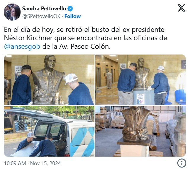“En el día de hoy se retiró el busto del expresidente Néstor Kirchner que se encontraba en las oficinas de Anses de la Avenida Paseo Colón”, notició la propia Pettovello desde su cuenta de X.