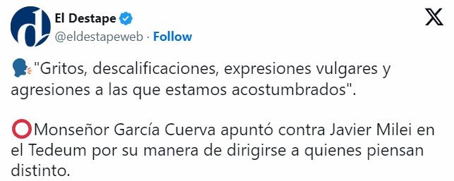Tras la firma del Pacto de Mayo en Tucumán, el presidente Javier Milei, participó junto a su gabinete del tradicional Tedeum en la Catedral Metropolitana de Buenos Aires por el Día de la Independencia. El acto fue encabezado por el arzobispo de Buenos Aires, Jorge García Cuerva, quien volvió a expresar fuertes críticas al gobierno de Milei.