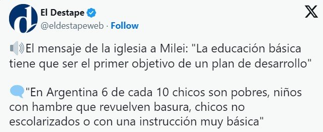 “Porque algo no está bien cuando tenemos dirigentes muy ricos y un pueblo trabajador muy pobre”, apuntó Cuerva. El discurso del arzobispo se da en medio del reclamo de la Iglesia por los comedores populares, tras la polémica por los alimentos almacenados en depósitos del ministerio de Capital Humano. Tres semanas atrás el presidente de la Conferencia Episcopal Argentina, Oscar Ojea, advirtió sobre situaciones de “confusión y de violencia” y pidió “no tirar la comida, porque falta en muchos hogares”.