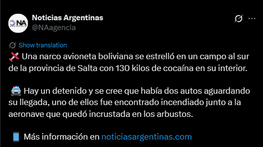 Una avioneta con matrícula boliviana que trasladaba 140 kilos de cocaína se estrelló en la ciudad salteña de Rosario de la Frontera y como consecuencia del hecho dos personas resultaron detenidas. La caída de la aeronave fue filmada por un vecino de la zona.