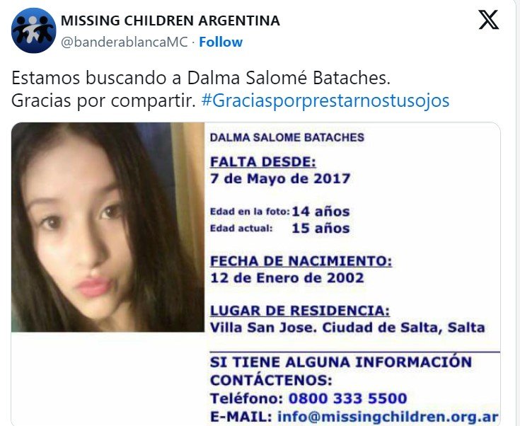 La Policía de Salta también informó que continúan los operativos de búsqueda de Jesica Gutiérrez, de 33 años de edad y madre de cuatro chicos, que se encuentra desaparecida desde la semana pasada cuando regresaba caminando desde el trabajo hasta su casa, y nunca llegó a su hogar en La Caldera. Desde las 23. 45 del 10 de septiembre, la mujer no dio más señales de vida y su celular está apagado.