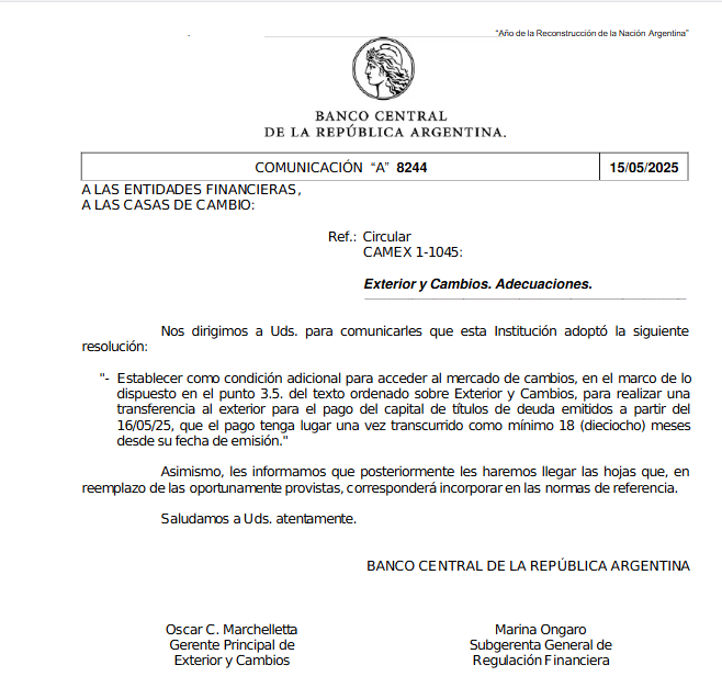 Pero este jueves el Central tuvo que apretar más las clavijas y sacó una circular que ajustó aún el cepo cambiario -que sigue existiendo- para clausurar este tipo de operaciones. Para lograrlo, la entidad que conduce Bausili alargó el plazo de acceso al dólar oficial para el repago de deuda corporativa de 6 a 18 meses, para cortar con esa estrategia cambiaria.
