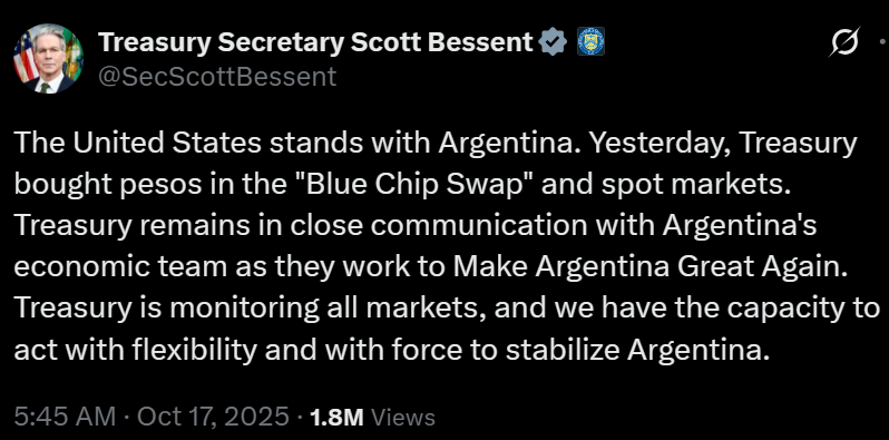 Secretario del Tesoro, Scott Bessent: Estados Unidos apoya a Argentina. Ayer, el Tesoro compró pesos en el mercado de swaps de Blue Chips y en el mercado al contado. El Tesoro se mantiene en estrecha comunicación con el equipo económico argentino mientras trabajan para que Argentina vuelva a ser grande. El Tesoro está monitoreando todos los mercados y tenemos la capacidad de actuar con flexibilidad y contundencia para estabilizar a Argentina.