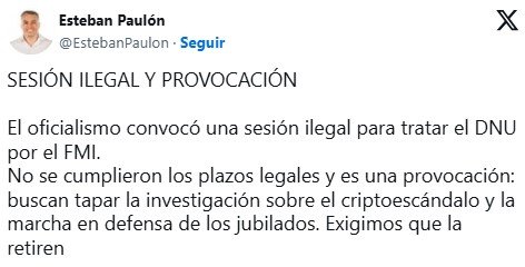 Otro planteo opositor es de poder la nulidad de la sesión del acuerdo con el FMI, como planteó el socialista Esteban Paulón. Entiende que el Gobierno no cumplió los plazos legales para tratar el DNU y no hay apuro. “Es una provocación: buscan tapar la investigación sobre el criptoescándalo y la marcha en defensa de los jubilados”, cuestionó Paulón, que integra el bloque de Miguel Pichetto, y exigió que el oficialismo retire la sesión.