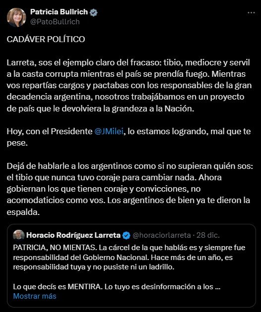 Sus dichos tuvieron lugar luego de que la exfuncionaria lo llamara “cadáver político”, y lo definiera como “el ejemplo claro del fracaso: tibio, mediocre y servil a la casta corrupta mientras el país se prendía fuego”. “Mientras vos repartías cargos y pactabas con los responsables de la gran decadencia argentina, nosotros trabajábamos en un proyecto de país que le devolviera la grandeza a la Nación”, cuestionó Bullrich.