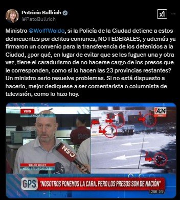 Apenas se conocieron sus declaraciones, la ministra de Seguridad Patricia Bullrich lo cruzó: “Ministro, si la Policía de la Ciudad detiene a estos delincuentes por delitos comunes, NO FEDERALES, y además ya firmaron un convenio para la transferencia de los detenidos a la Ciudad, ¿por qué, en lugar de evitar que se les fuguen una y otra vez, tiene el caradurismo de no hacerse cargo de los presos que le corresponden, como sí lo hacen las 23 provincias restantes? Un ministro serio resuelve problemas. Si no está dispuesto a hacerlo, mejor dedíquese a ser comentarista o columnista de televisión, como lo hizo hoy”.