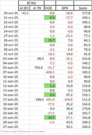 El Tesoro solo logró recaudar 15,6 billones de pesos en noviembre, apenas por encima del vencimiento de deuda del mes, mientras el saldo en pesos del Banco Central es de 4,1 billones. La mayor demanda estacional de diciembre y la presión inflacionaria anticipan subas de tasas de interés para contener la liquidez.