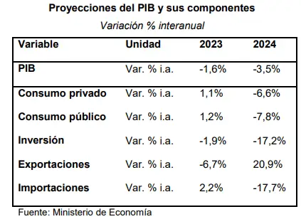 En ese sentido, si se pone el ojo en las principales proyecciones macroeconómicas para 2024, el documento señala con respecto al Producto Interno Bruto (PIB) que se espera “una caída del 3,5% para 2024”, en tanto que por sectores destaca que “el sector Agropecuario crece 34,6%, la producción de soja sube de 25,0 a 49,7 millones de toneladas (MT) (+98%) y la de maíz de 41,4 a 56,0 MT (+35%), y la Industria y el Comercio –los sectores de mayor peso– se proyectan con bajas de -9,8% y -9,1%».