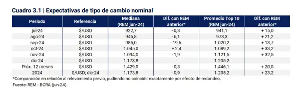 Al respecto, analistas estiman que, para llegar a ese porcentaje de inflación a fin de año, el alza promedio de los próximos meses -incluido junio- debería rondar sí o sí el 4%. Sobre ello, las estimaciones privadas expresadas en el Relevamiento de Expectativas del Mercado (REM) del BCRA anticiparon para el sexto mes del año una inflación mensual de 5,2% para junio, en tanto que para julio proyectaron una inflación mensual de 4,8% y para el año de 138,1% interanual. A su vez, la mediana del denominado Top 10 (los 10 que más aciertan) fijó un valor para el tipo de cambio nominal a diciembre de 2024 de $1.205.