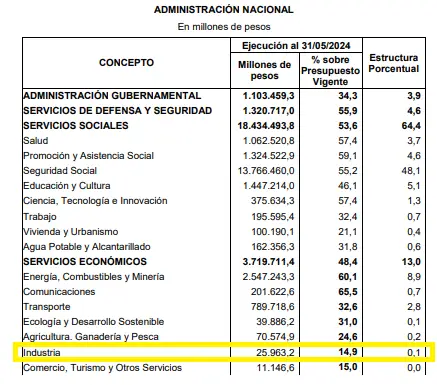 El documento de Presupuesto da cuenta en el apartado por finalidad y función y grado de ejecución del gasto público que al 31 de mayo de este año se ejecutó solamente el 1% de lo presupuestado para la industria en 2024.