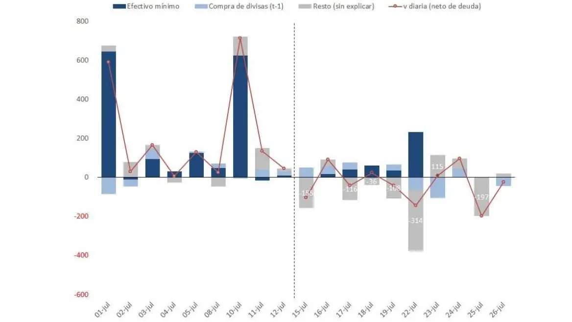 Como resultado, julio quedó en terreno negativo (-10 millones de dólares), aunque con dos mitades: crecieron 250 millones de dólares entre el 1 y el 18 y -260 millones entre el 19 y el 26. Por su parte, las reservas retrocedieron 260 millones esta semana, donde la baja de 165 millones se explica por la compra de divisas que va del viernes 19 de julio al jueves 25, ya que, desde este mes, la autoridad monetaria está operando con un día de rezago en el mercado, mientras que las operaciones de efectivo mínimo atenuaron esta caída en 230 millones el lunes.