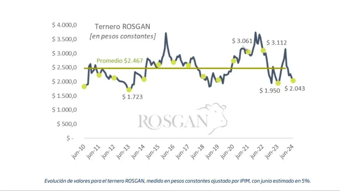 Si bien en los últimos 12 meses, el precio de la hacienda en pie le ganó a la inflación, en junio, particularmente «los precios de la cadena están debilitados». Los precios del ternero y novillito caen respecto a mayo y se ubican por debajo de la inflación, perdiendo un 6 por ciento de su valor real. En el mostrador la evolución fue similar, perdiendo contra la inflación en junio y también en el último año», señala el informe de Rosgan.