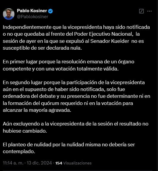 Para el ex diputado nacional Pablo Kosiner, “independientemente de que la vicepresidenta haya sido notificada o no de que quedaba al frente del Poder Ejecutivo Nacional, la sesión en la que se expulsó al senador Kueider no es susceptible de ser declarada nula”.