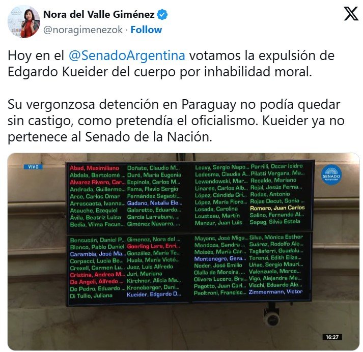 “Tienen mucho miedo de que hable”, sostuvo por su parte la actual senadora nacional Nora Giménez, a la vez que añadió que Kueider, “avalado por el gobierno”, pretende “a través de un artilugio legal, recuperar la banca de la que fue expulsado”