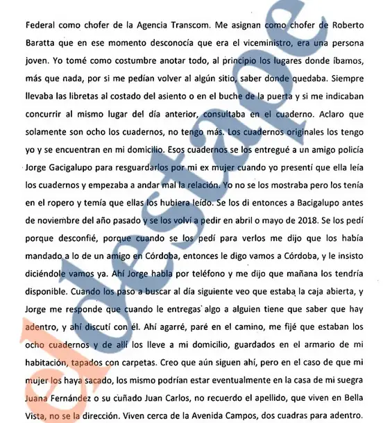 - “Los cuadernos originales los tengo yo y se encuentran en mi domicilio”. Agregó que estaban “guardados en el armario de mi habitación, tapados con carpetas. Creo que aún siguen ahí, pero en el caso de que mi mujer los haya sacado, los mismos podrían estar eventualmente en la casa de mi suegra”.