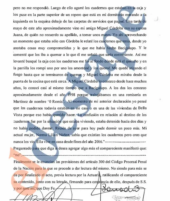 - “Me levanté, busqué la caja con los cuadernos y me fui al fondo donde está el quincho y en la parrilla los rompí uno por uno, los amontoné y los quemé. Me quedé atizando el fuego hasta que se terminaron de quemar”. Como justificación de este cambio de versión, agregó: “Al momento de mi anterior declaración yo pensé que los cuadernos todavía estaban en mi casa o en una de las viviendas de Bella Vista porque eso había querido hacer. La confusión en relación al destino de los cuadernos fue por la situación que estaba viviendo, estaba detenido hacía dos días y no había podido dormir”.