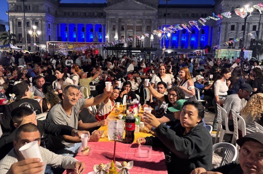 Una marea humana transformó en pocas horas la Plaza Congreso en el patio de una familia enorme. Adentro del Palacio Legislativo, el eco de las leyes que en el primer año de Javier Milei como presidente golpearon duramente a las clases trabajadoras. Afuera, una fiesta callejera reunió a miles para compartir la Nochebuena. Desde la tarde del martes 24 de diciembre, voluntarios, personas en situación de calle, o que simplemente no querían pasar solas la Navidad, protagonizaron un abrazo colectivo que significó mucho más que una cena.