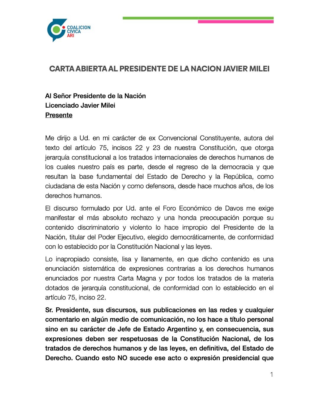 Me dirijo a Ud. en mi carácter de ex Convencional Constituyente, autora del texto del artículo 75, incisos 22 y 23 de nuestra Constitución, que otorga jerarquía constitucional a los tratados internacionales de derechos humanos de los cuales nuestro país es parte, desde el regreso de la democracia y que resultan la base fundamental del Estado de Derecho y la República, como ciudadana de esta Nación y como defensora, desde hace muchos años, de los derechos humanos.