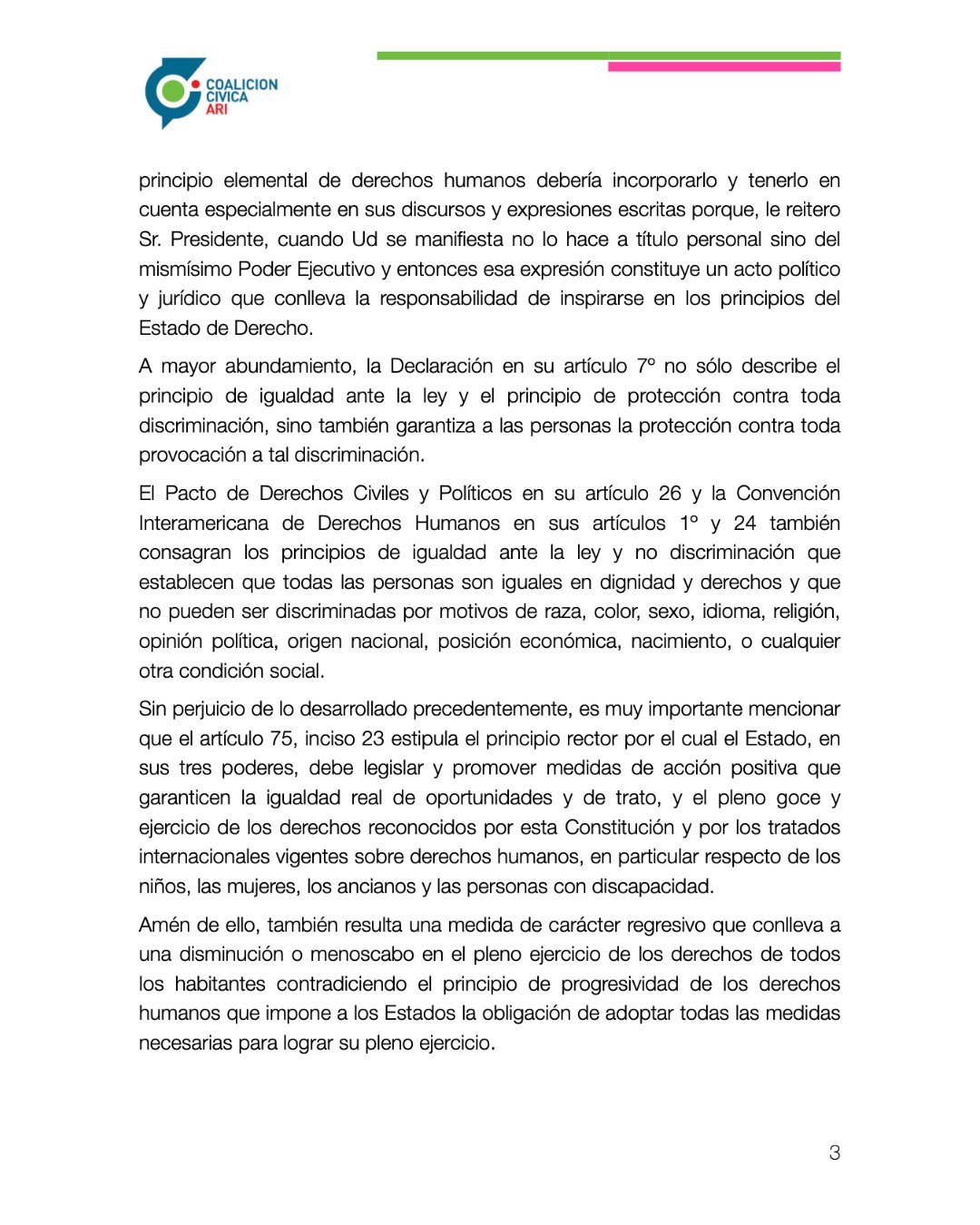 La Declaración Universal de Derechos Humanos establece que “Todos los seres humanos nacen libres e iguales en dignidad y derechos…[y que]…Toda persona tiene los derechos y libertades […] sin distinción alguna de raza, color, sexo, idioma, religión, opinión política o de cualquier otra índole, origen nacional o social, posición económica, nacimiento o cualquier otra condición”, este principio elemental de derechos humanos debería incorporarlo y tenerlo en cuenta especialmente en sus discursos y expresiones escritas porque, le reitero Sr. Presidente, cuando Ud se manifiesta no lo hace a título personal sino de mismísimo Poder Ejecutivo y entonces esa expresión constituye un acto político y jurídico que conlleva la responsabilidad de inspirarse en los principios del Estado de Derecho.
