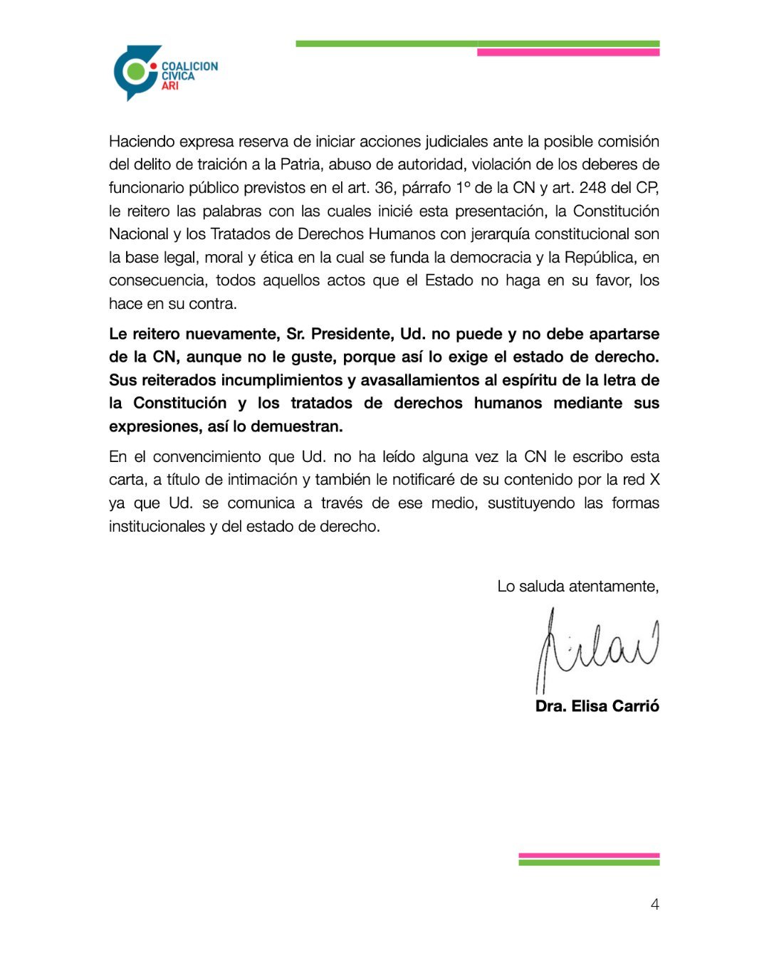 “El principio de igualdad ante la ley consagrado en el artículo 16 de la Constitución Nacional establece que todos somos iguales ante la ley y, en consecuencia, los miembros de los tres poderes del Estado tienen prohibido todo acto que implique cualquier discriminación por motivos de raza, color, sexo, orientación sexual, género, idioma, religión, opiniones políticas o de cualquier índole, origen nacional o social, posición económica, nacimiento o cualquier otra condición social y, por el contrario deben garantizar a todas las personas protección efectiva contra ella”, explica Carrió, al tiempo que no descarta “iniciar acciones judiciales ante la posible comisión del delito de traición a la Patria, abuso de autoridad, violación de los deberes de funcionario público”.