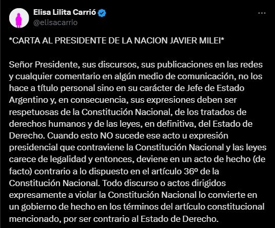Por su parte, Lilita Carrió, también este jueves, publicó una carta dirigida al “Señor Presidente”. Allí, la dirigente le recordó a Milei que, sus discursos, sus publicaciones en las redes y cualquier comentario en algún medio de comunicación, “no los hace a título personal sino en su carácter de Jefe de Estado Argentino y, en consecuencia, sus expresiones deben ser respetuosas de la Constitución Nacional, de los tratados de derechos humanos y de las leyes, en definitiva, del Estado de Derecho”.