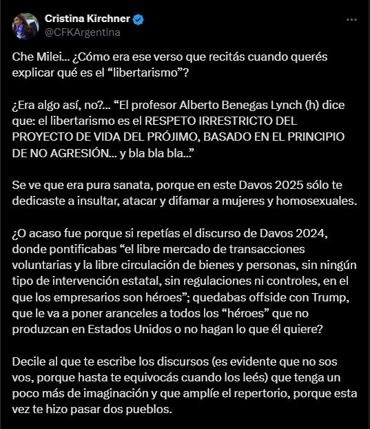 “Che Milei… ¿Cómo era ese verso que recitás cuando querés explicar qué es el ‘libertarismo’?”, ironizó Cristina, aludiendo a las referencias del presidente al economista Alberto Benegas Lynch (h)“Se ve que era pura sanata, porque en este Davos 2025 solo te dedicaste a insultar, atacar y difamar a mujeres y homosexuales”, agregó.