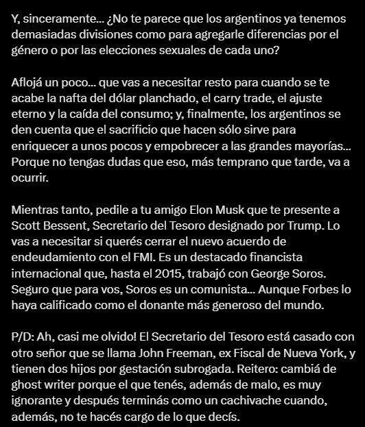Además, hizo referencia a Scott Bessent, el designado secretario del Tesoro de Trump, quien trabajó con George Soros y está casado con el exfiscal de Nueva York John Freeman, con quien tiene dos hijos por gestación subrogada. “Cambiá de ghostwriter porque el que tenés, además de malo, es muy ignorante y después terminás como un cachivache”, sentenció. Y agregó: “Decile al que te escribe los discursos (es evidente que no sos vos, porque hasta te equivocás cuando los leés) que tenga un poco más de imaginación y que amplíe el repertorio, porque esta vez te hizo pasar dos pueblos”.