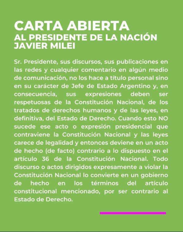 Sr. Presidente, sus discursos, sus publicaciones en las redes y cualquier comentario en algún medio de comunicación, no los hace a título personal sino en su carácter de Jefe de Estado Argentino y, en consecuencia, sus expresiones deben ser respetuosas de la Constitución Nacional, de los tratados de derechos humanos y de las leyes, en definitiva, del Estado de Derecho. Cuando esto NO sucede ese acto o expresión presidencial que contraviene la Constitución Nacional y las leyes carece de legalidad y entonces deviene en un acto de hecho (de facto) contrario a lo dispuesto en el artículo 36 de la Constitución Nacional. Todo discurso o actos dirigidos expresamente a violar la Constitución Nacional lo convierte en un gobierno de hecho en los términos del artículo constitucional mencionado, por ser contrario al Estado de Derecho.