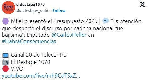 Por su parte, el diputado de UP Carlos Heller sostuvo en diálogo con El Destape 1070 que “la atención que despertó el discurso por cadena nacional fue bajísima”. Y desarrolló: “Un dato a tener en cuenta, se hizo esto el domingo a las 21 por el prime time y la gente se bajó. Solo el discurso está plagado de cuestiones incomprobables con números y porcentajes que él sólo sabe cómo se componen”.