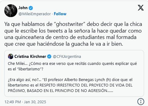 Cristina había escrito antes que a Milei le escribieron el discurso y lo hicieron pasarse dos pueblos. «Decile al que te escribe los discursos (es evidente que no sos vos, porque hasta te equivocás cuando los leés) que tenga un poco más de imaginación y que amplíe el repertorio, porque esta vez te hizo pasar dos pueblos«, afirmó. «Cambiá de ghost writer porque el que tenés, además de malo, es muy ignorante y después terminás como un cachivache cuando, además, no te hacés cargo de lo que decís», agregó.