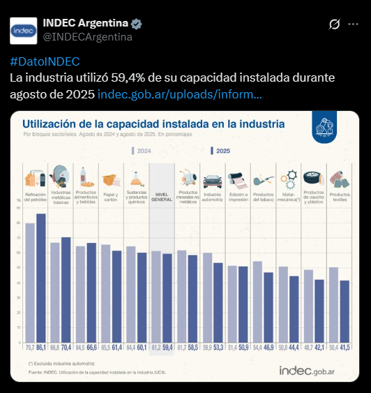 En agosto de 2024, en medio del parate industrial marcado por la caída de los ingresos de la primera etapa del gobierno de Javier Milei, el indicador marcó que el uso de la capacidad instalada fue del 61,2%. Contra julio de 2025, el indicador de agosto mostró una leve mejora ya que en el séptimo mes del año marcó un 58,2%.