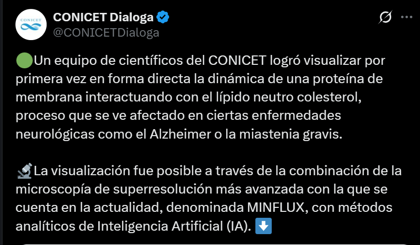 Un equipo del Consejo Nacional de Investigaciones Científicas y Técnicas (CONICET) logró visualizar por primera vez en forma directa la dinámica de una proteína de membrana interactuando con el lípido neutro colesterol, proceso que se ve afectado en ciertas enfermedades neurológicas, como el Alzheimer o la miastenia gravis.