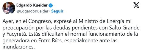 Sin embargo, esta misma tarde, el interbloque Las Provincias Unidas emitió un comunicado en el que “ante la situación de público conocimiento respecto del senador Edgardo Kueider, manifestamos nuestra firme voluntad a favor de que la Justicia investigue los hechos hasta el esclarecimiento. Reafirmamos que todos los funcionarios públicos de los poderes del Estado estamos obligados a someternos a la Justicia cuando lo requiera”.